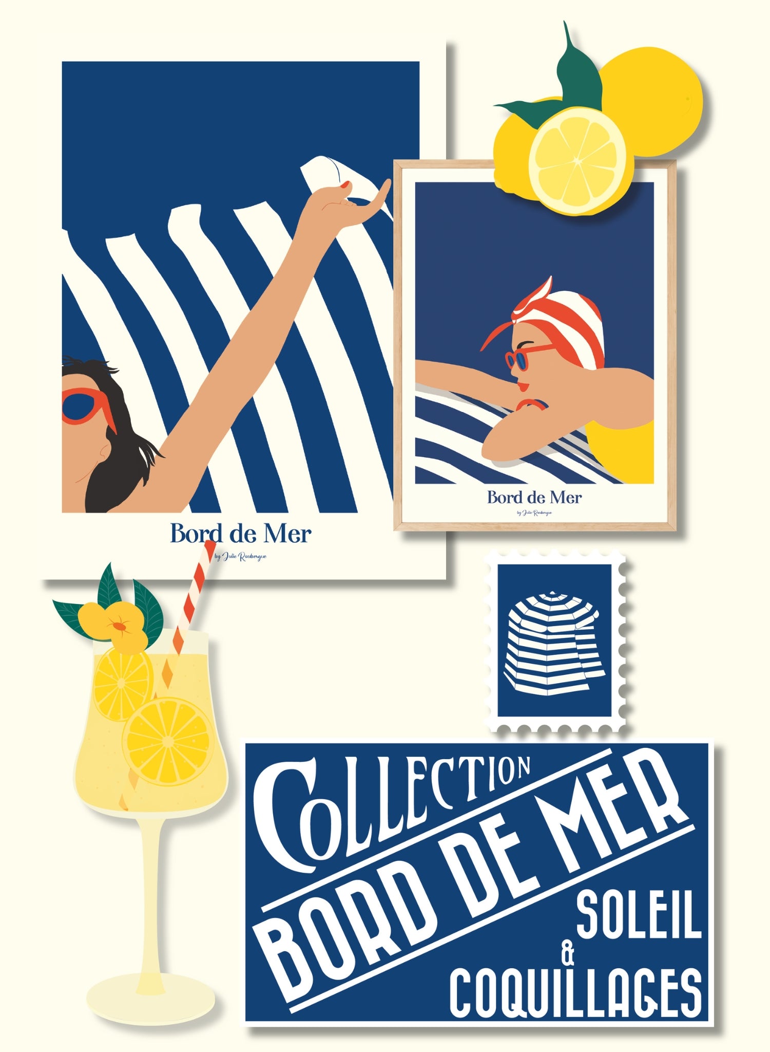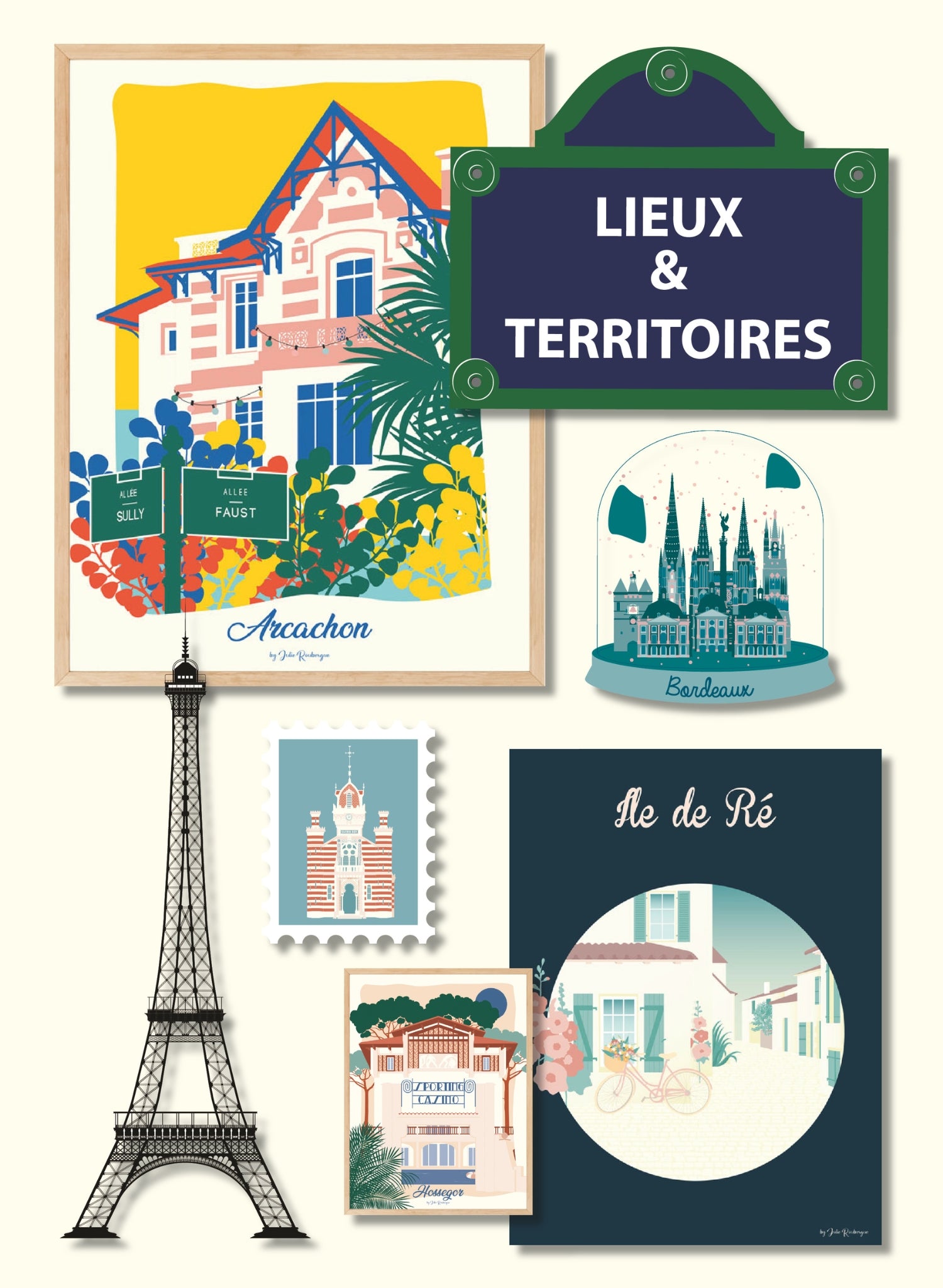 Vous trouverez dans mes collections aussi bien des affiches de villes emblématiques comme Quiberon, Toulouse ou Arcachon, que des créations plus lifestyle autour du surf, des fleurs ou de la vie quotidienne.