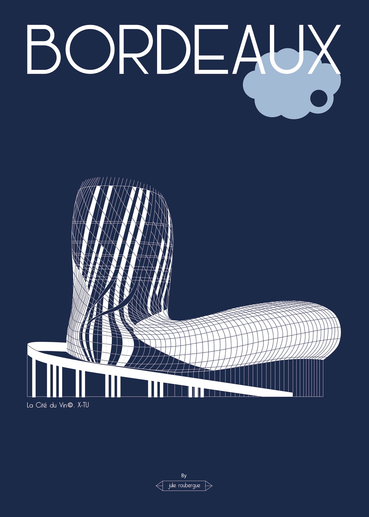 Deux versions sont proposées : une version claire (fond blanc, lignes marine) et une version inversée (fond marine, structure en blanc), pour un effet graphique fort. Le dessin minimaliste, composé de lignes et courbes dynamiques, rend hommage à l’architecture audacieuse du lieu tout en s’inscrivant dans une esthétique design, sobre et géométrique.