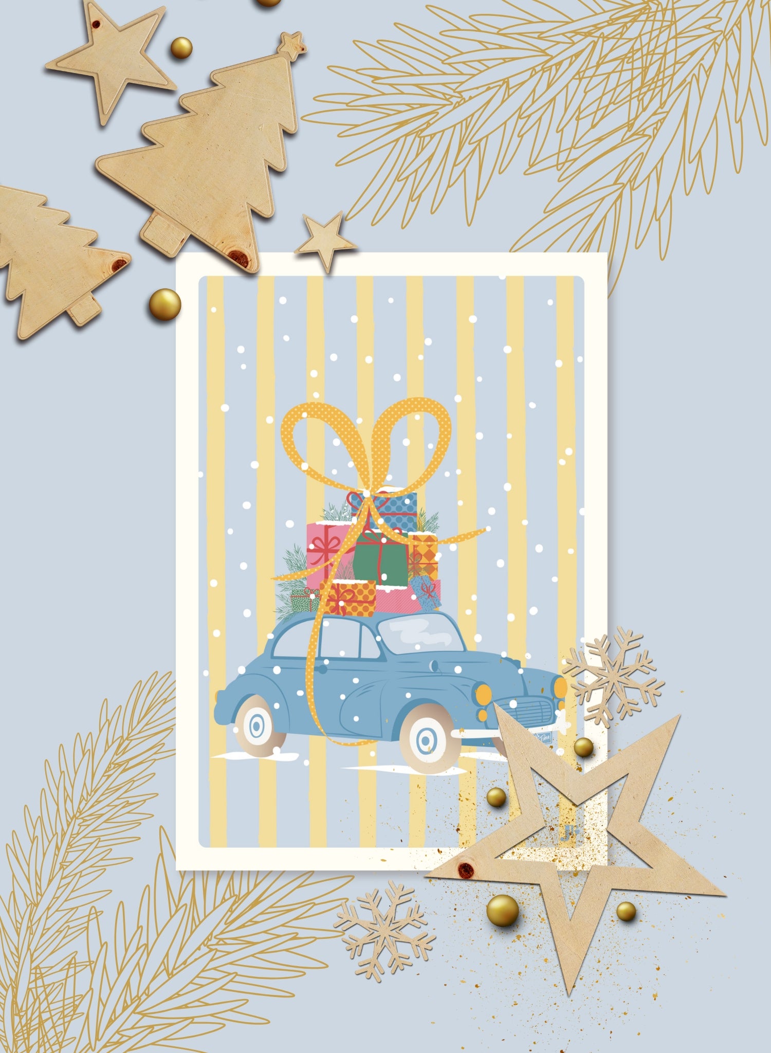 Une petite voiture rétro file sous les flocons, chargée de cadeaux colorés, tous ficelés ensemble par un grand ruban à pois. La plaque d’immatriculation annonce la magie : "Christmas Time". Une illustration pleine d’élan, de douceur et d’esprit festif !